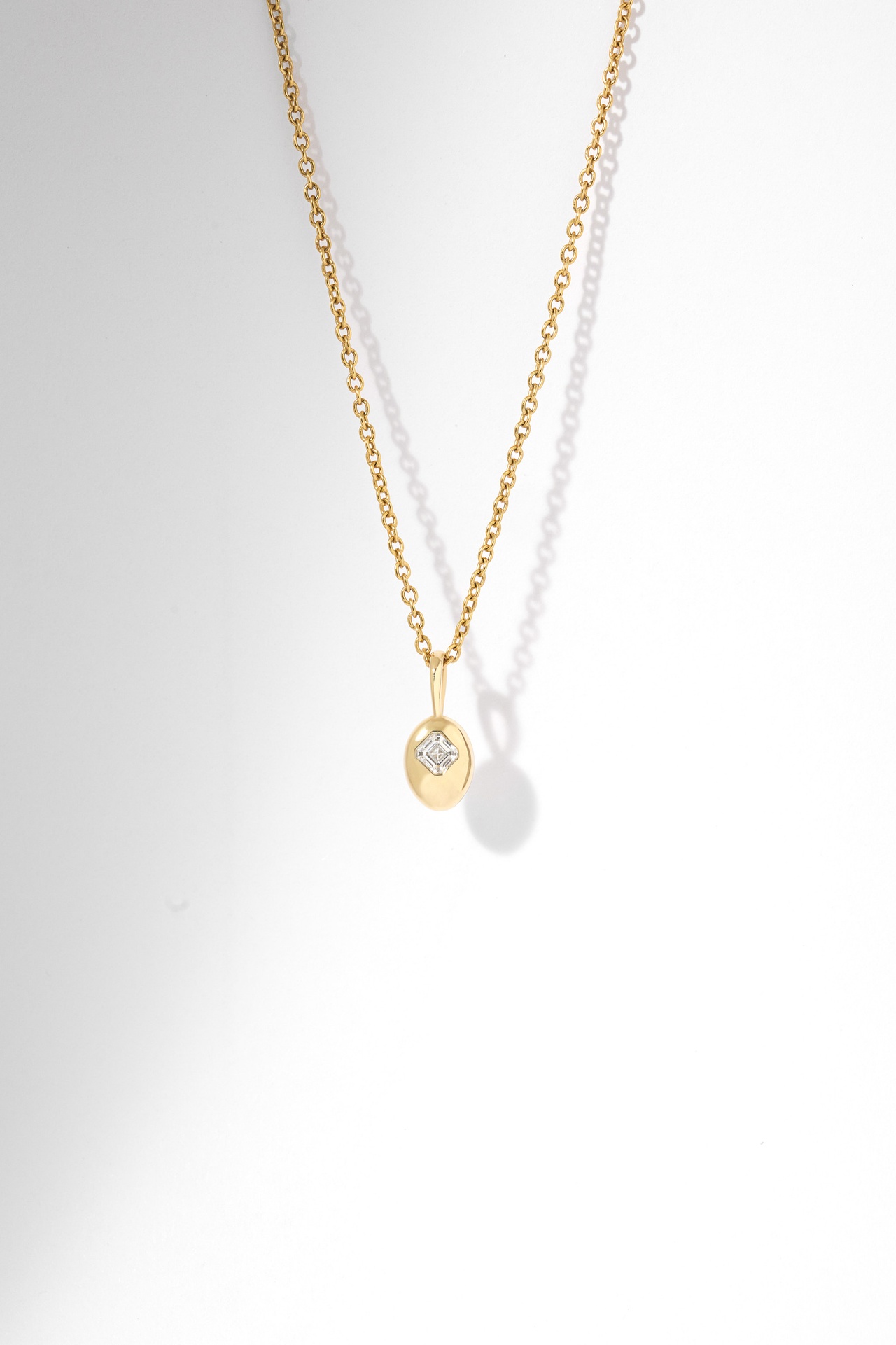 The Asscher Diamond Pendant is hand-finished with an asscher cut diamond nestled into its surface. Each piece is shaped to feel soft, sculptural, and intentionally imperfect in that Figursky way.
