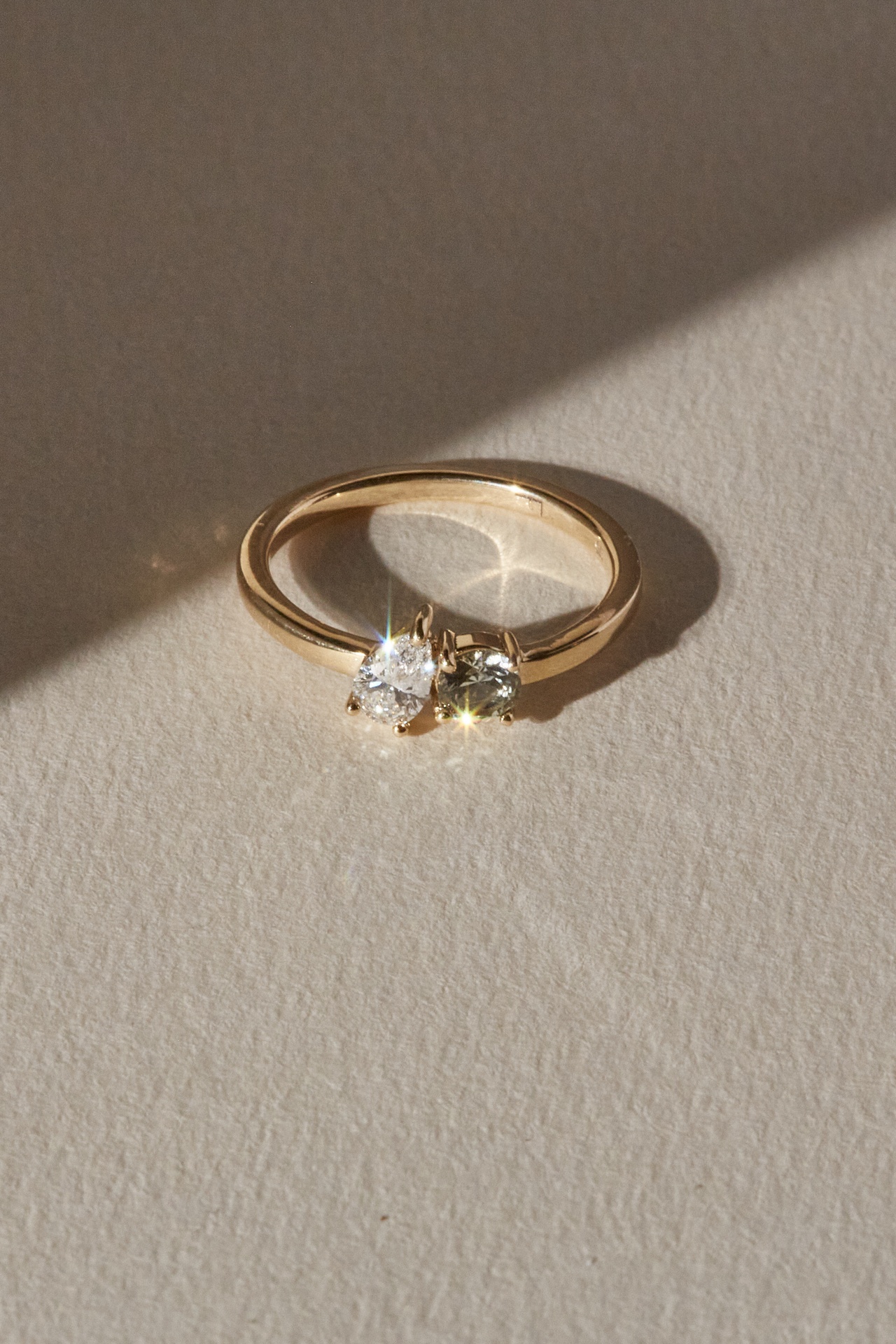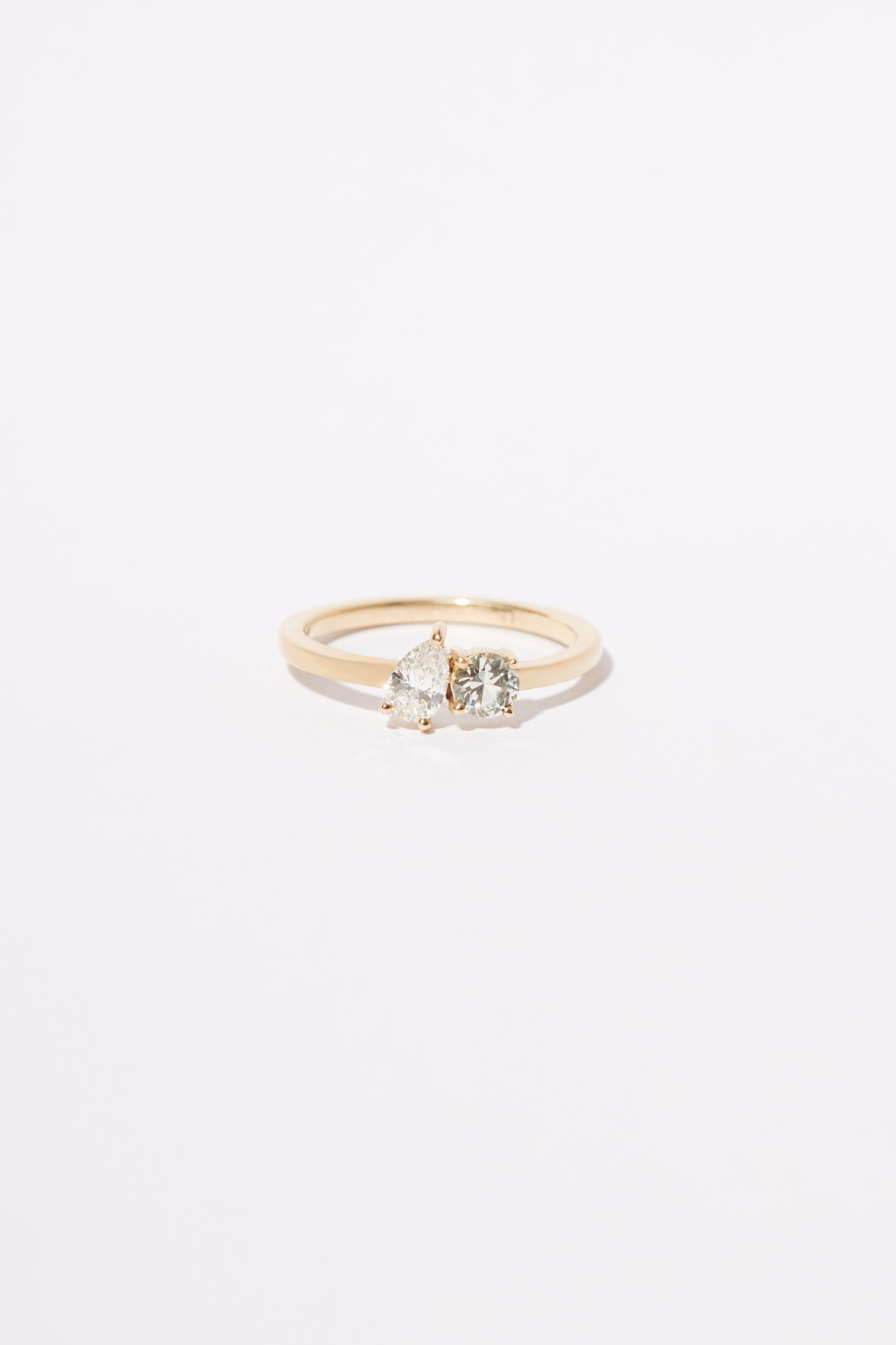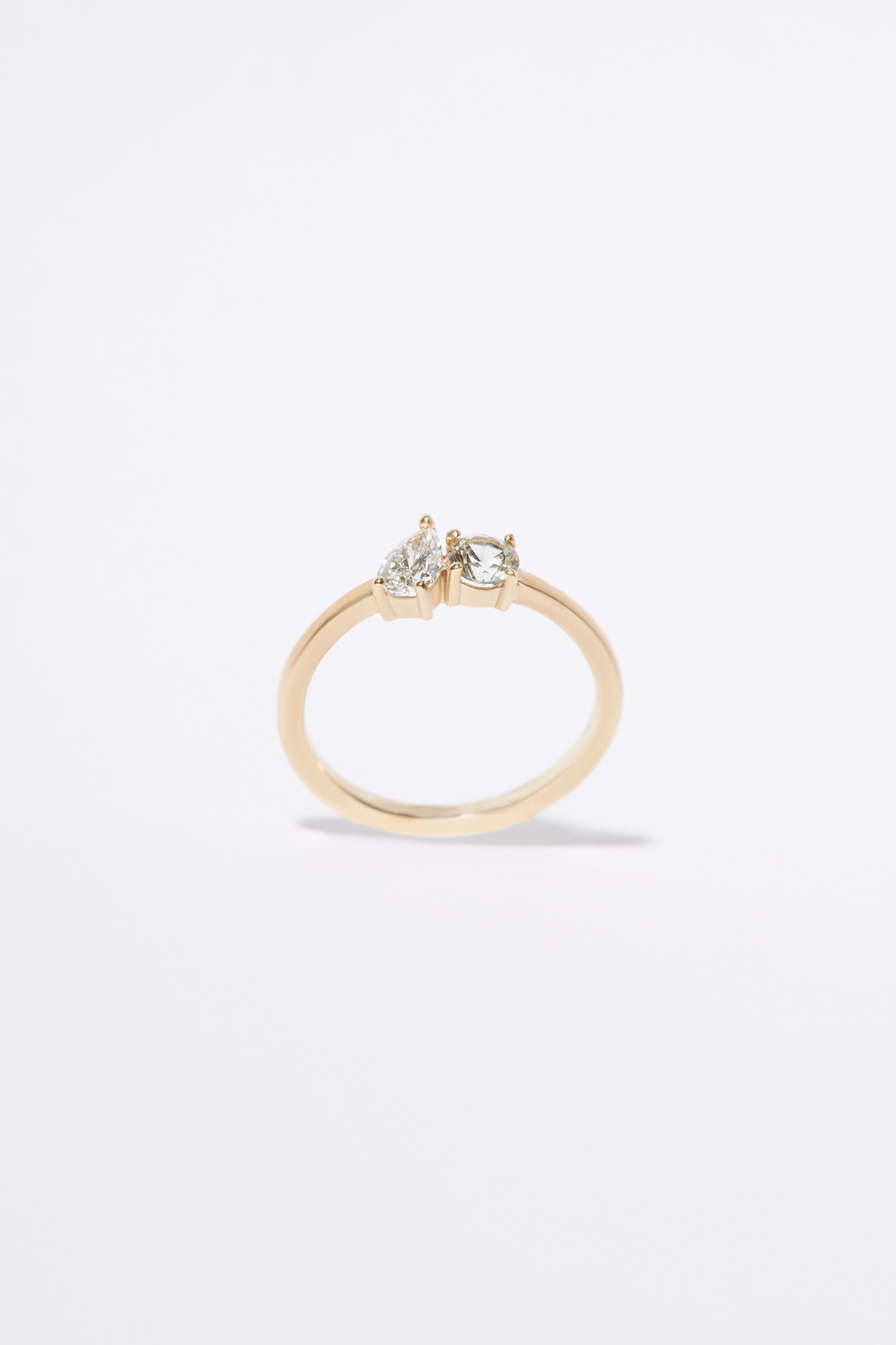 The Moi et Toi classic ring features a 0.25ct pear cut lab Diamond in a prong setting leaning over a round 0.2ct Australian Sapphire.