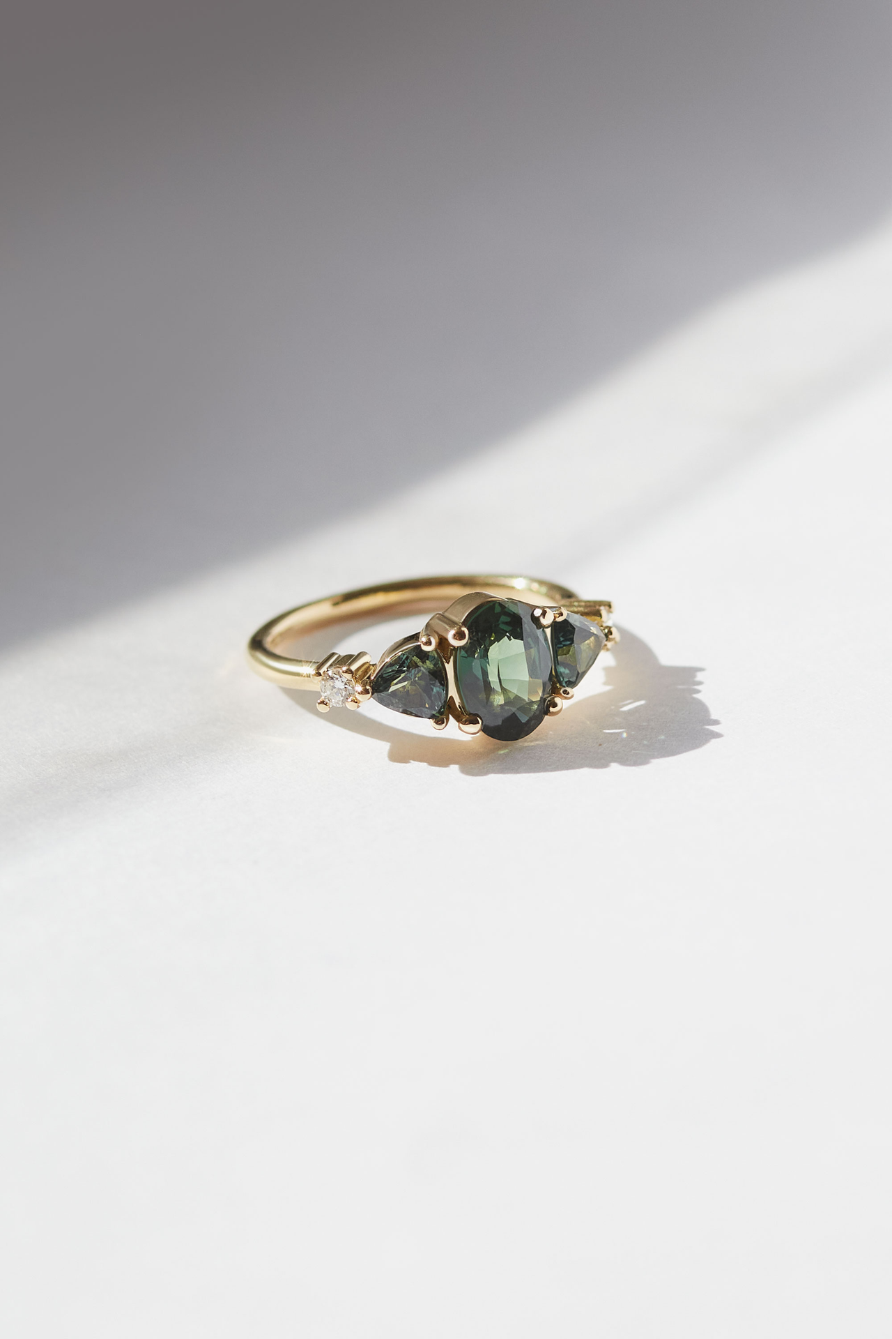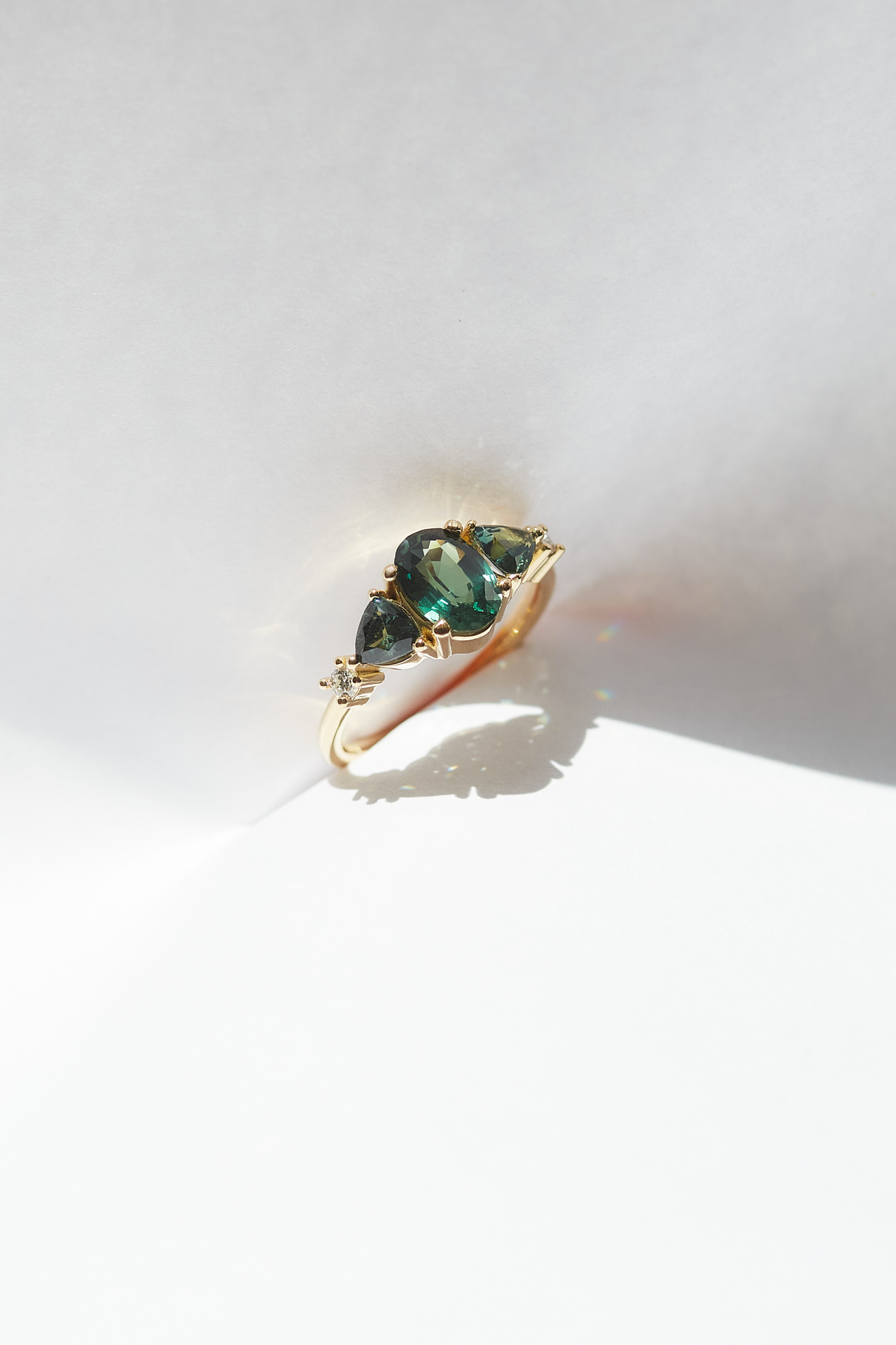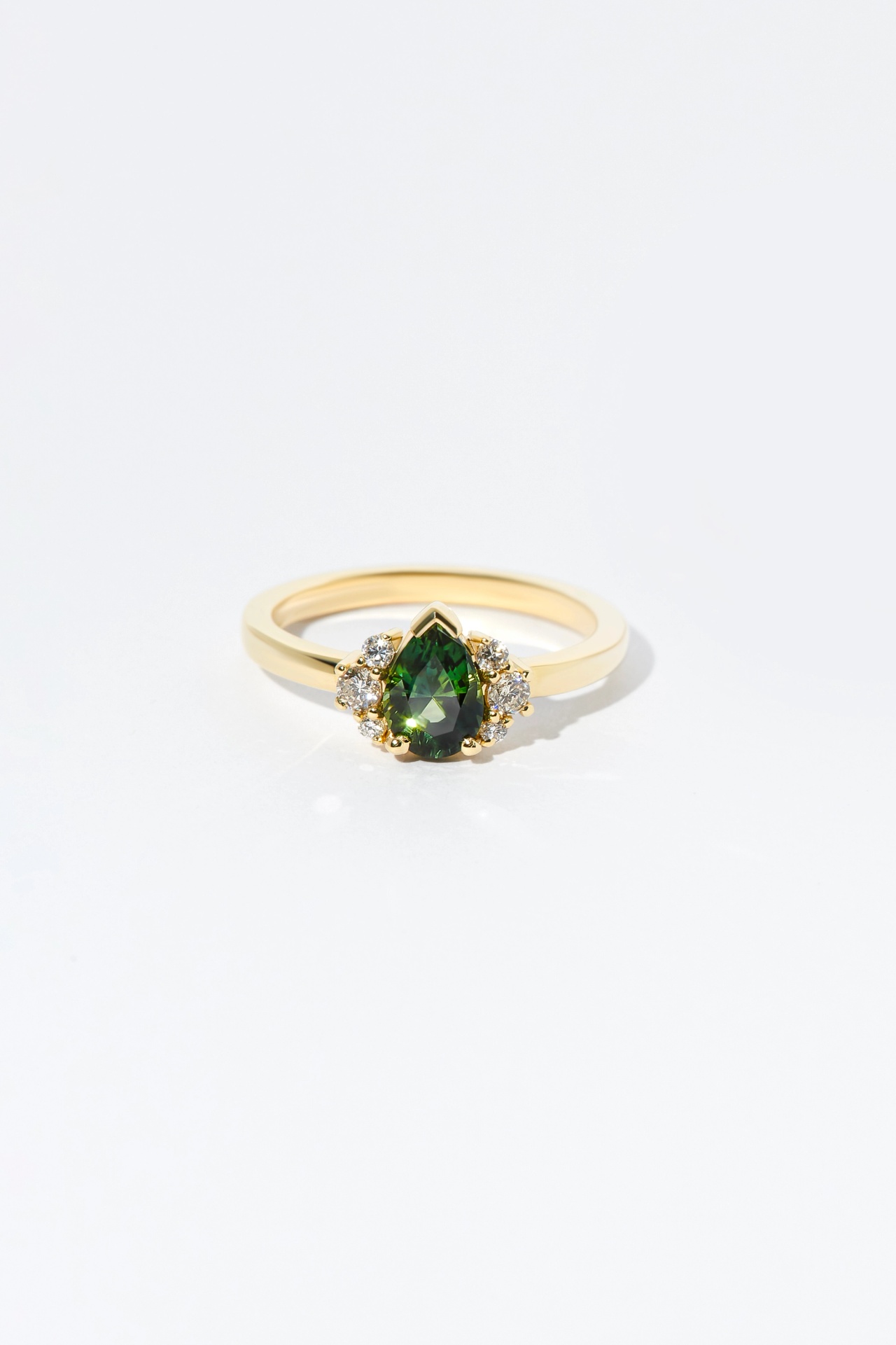 The Ish ring features a 0.95ct pear cut Green Sapphire flanked by three natural diamonds on each side. A symmetrical and timeless engagement ring that has family and tradition at heart.