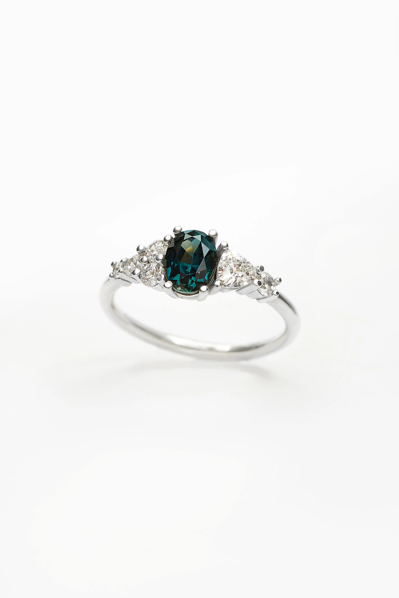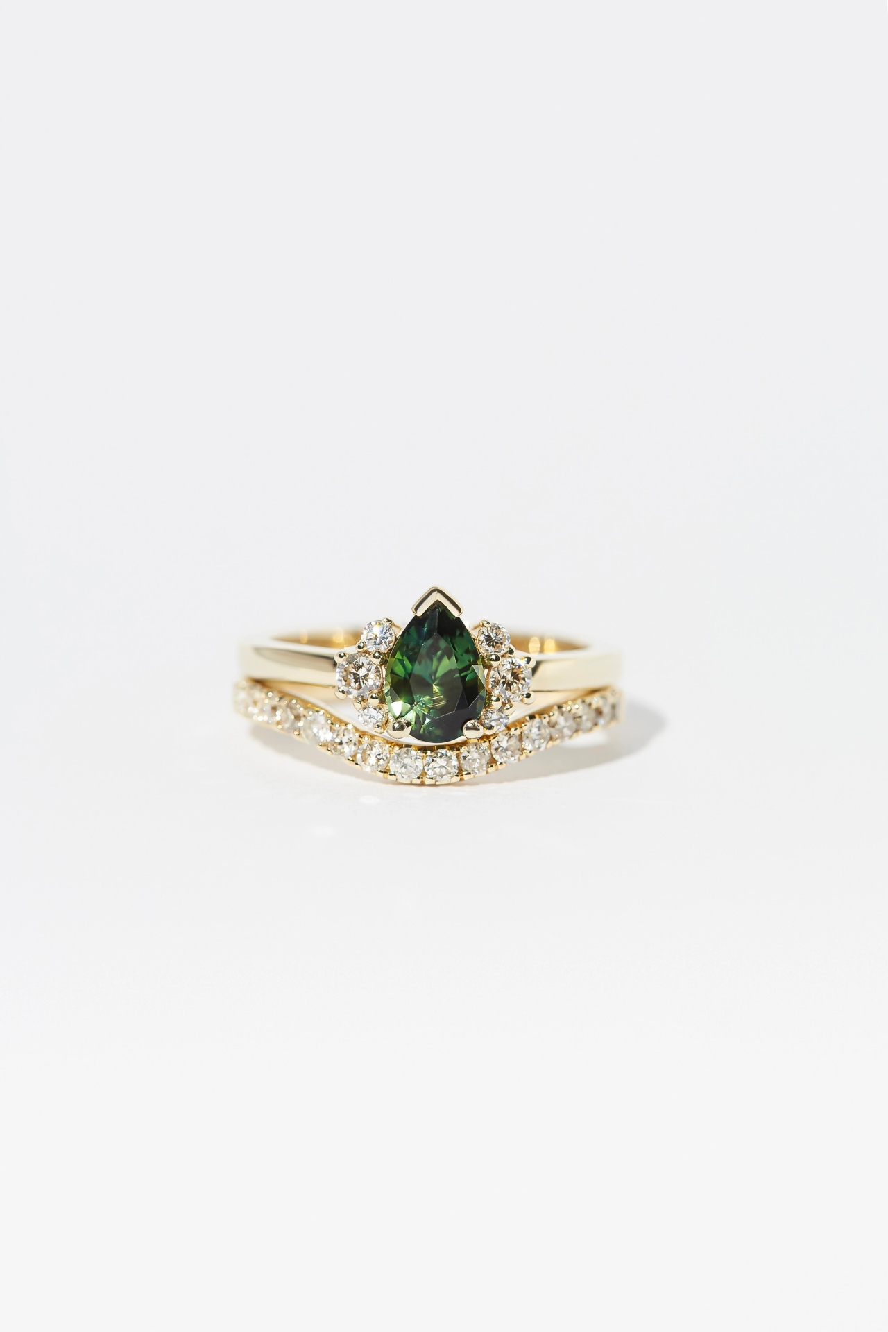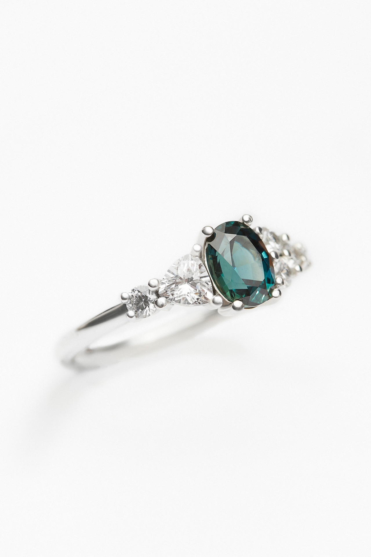 The Ish ring features a 0.95ct pear cut Green Sapphire flanked by three natural diamonds on each side. A symmetrical and timeless engagement ring that has family and tradition at heart.