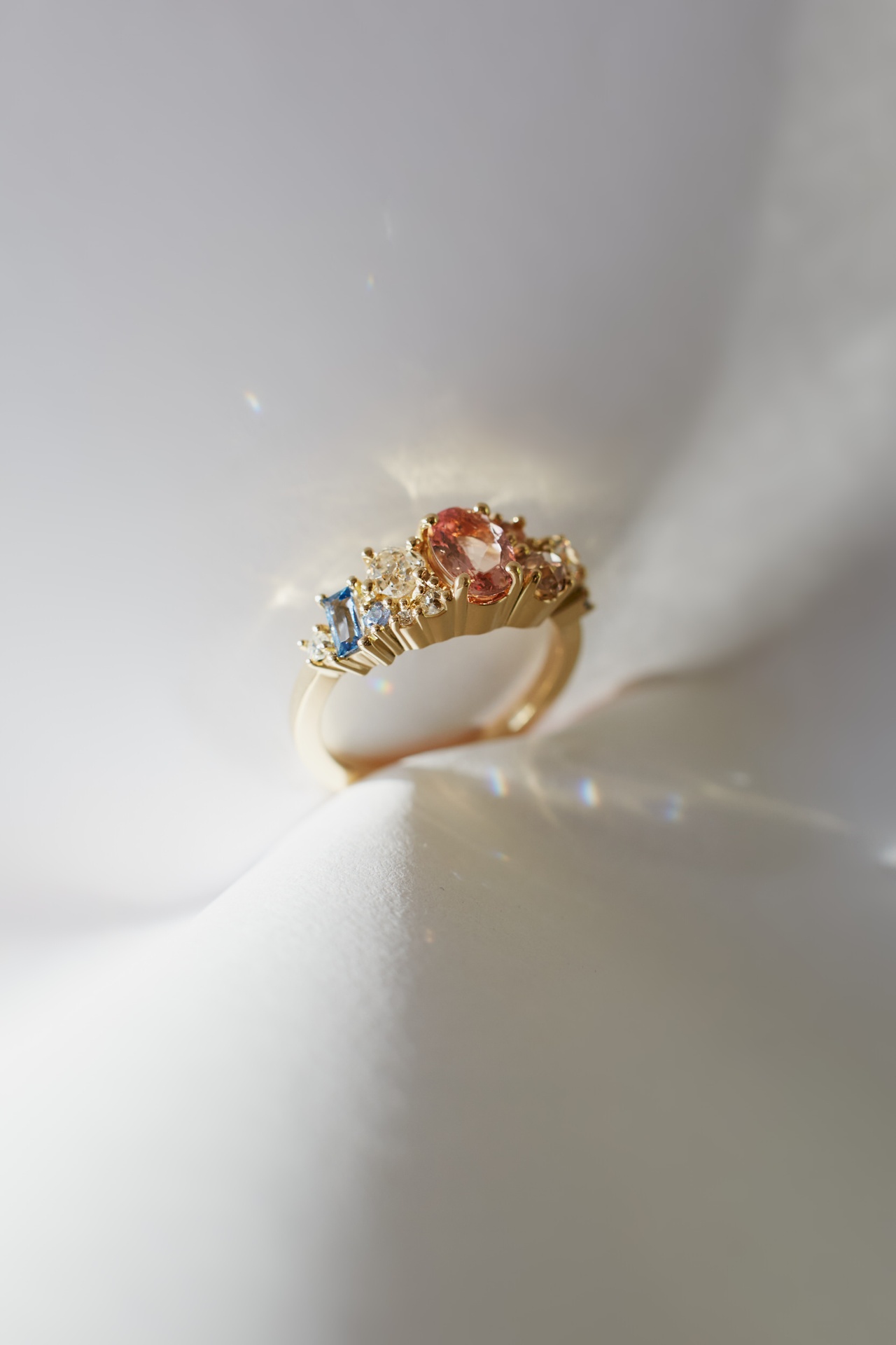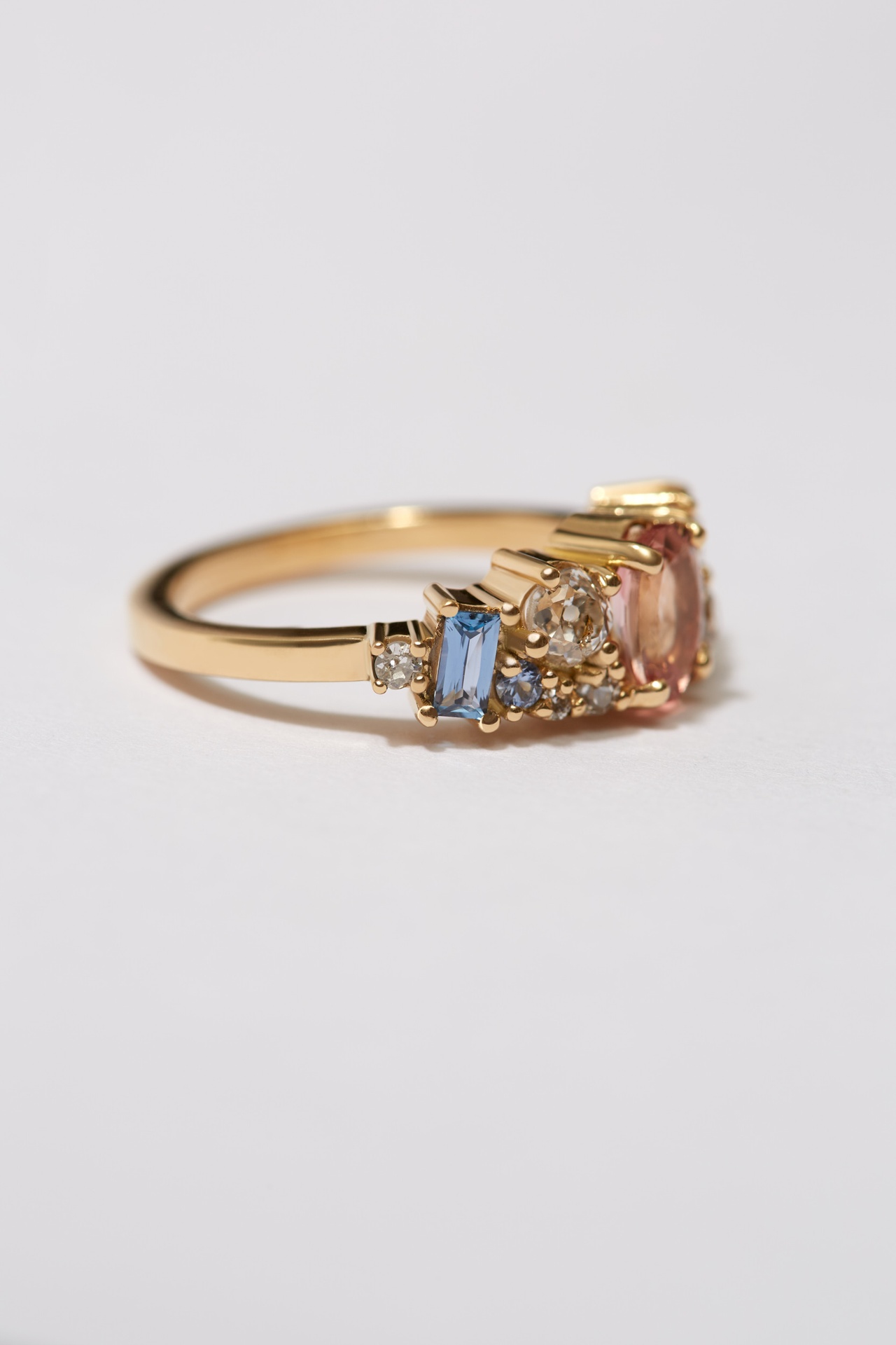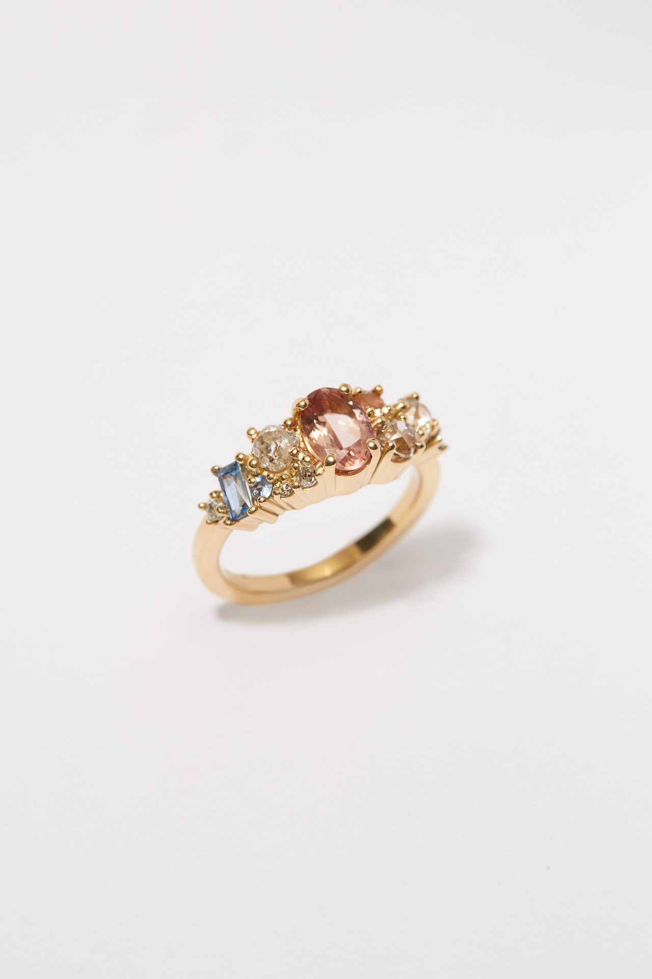 The Maike Ring features an elongated hexagonal Morganite with asymmetrical shoulders.