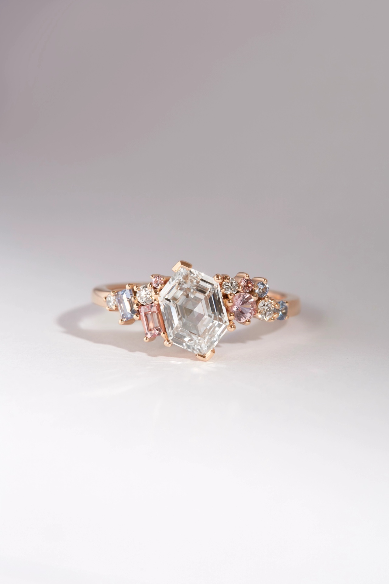 The Megan Ring features a leaning 1.5ct step cut hexagonal Diamond, followed by a play of blue and pink sapphires and spinels and diamonds asymmetrically clustered on the shoulders.