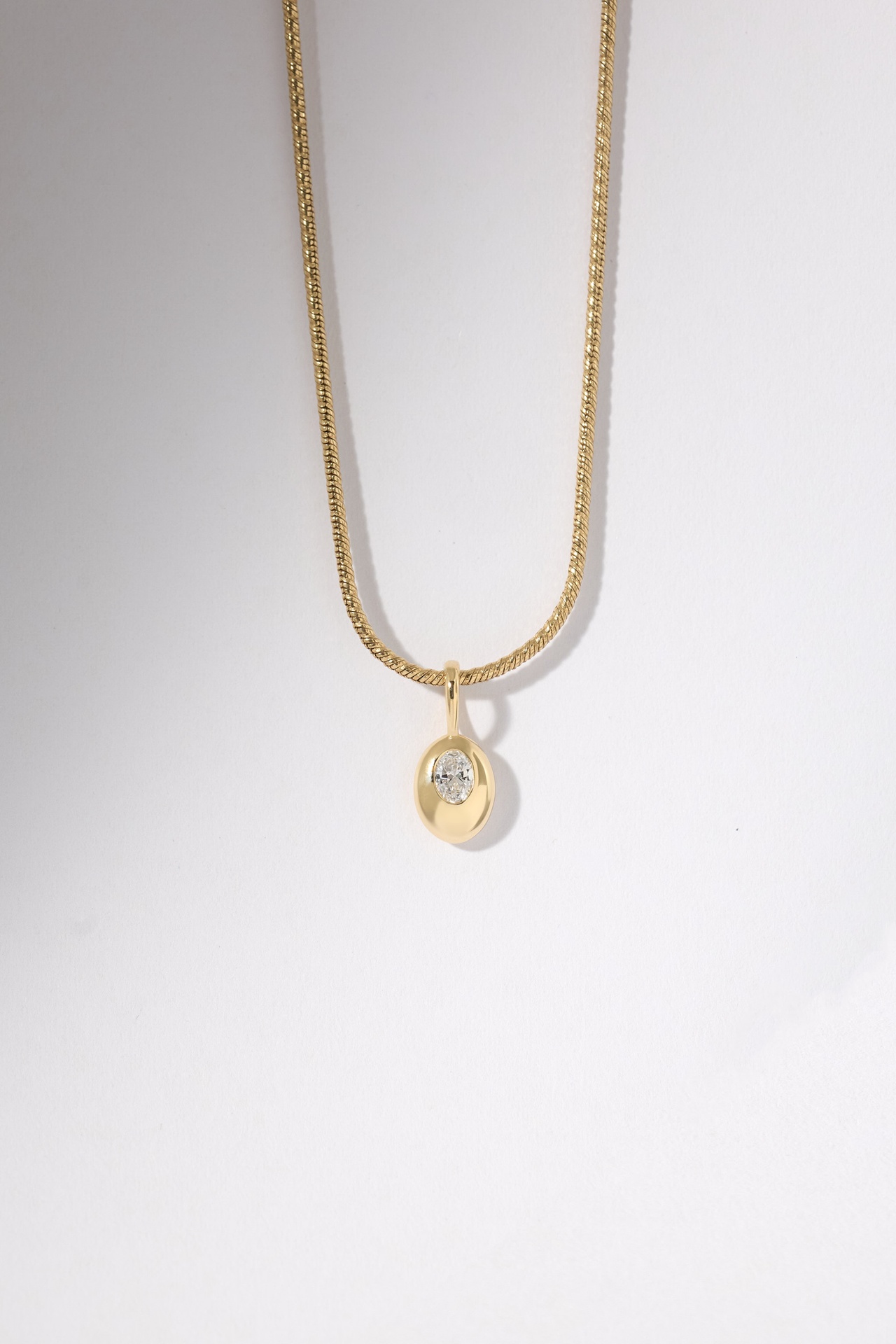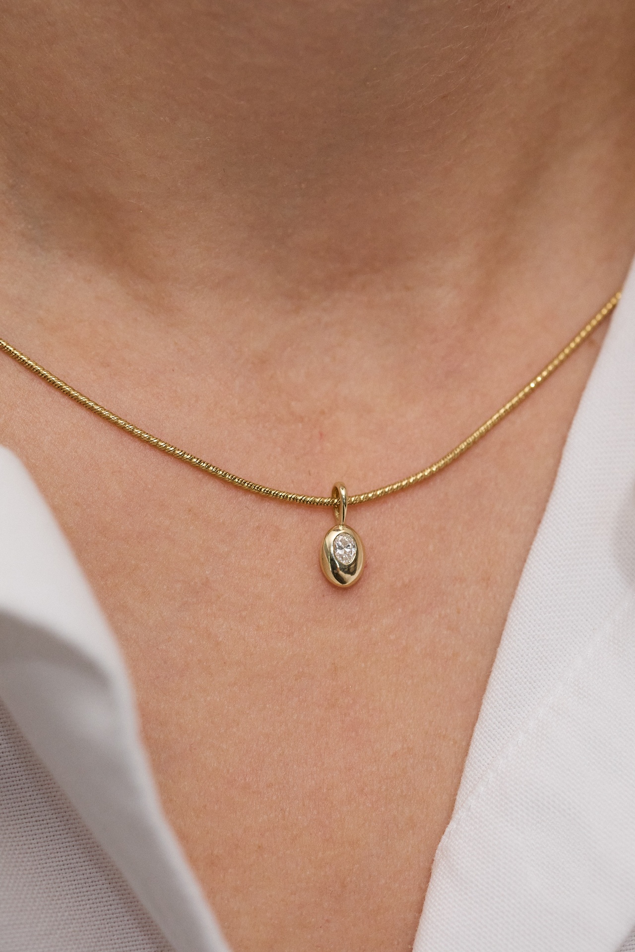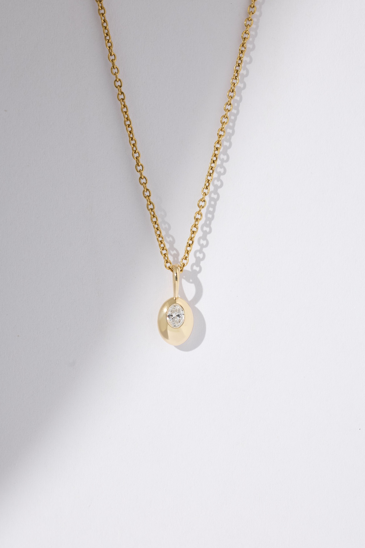 The Oval Diamond Pendant is hand-finished with an oval cut diamond nestled into its surface. Each piece is shaped to feel soft, sculptural, and intentionally imperfect in that Figursky way.