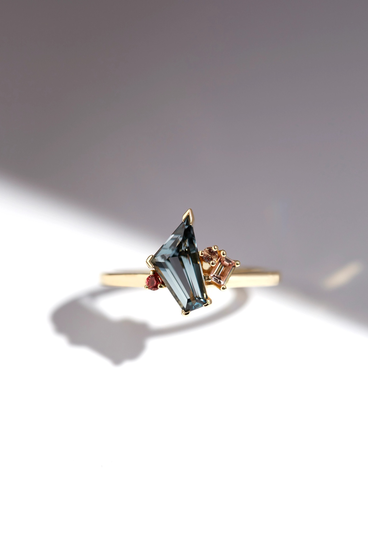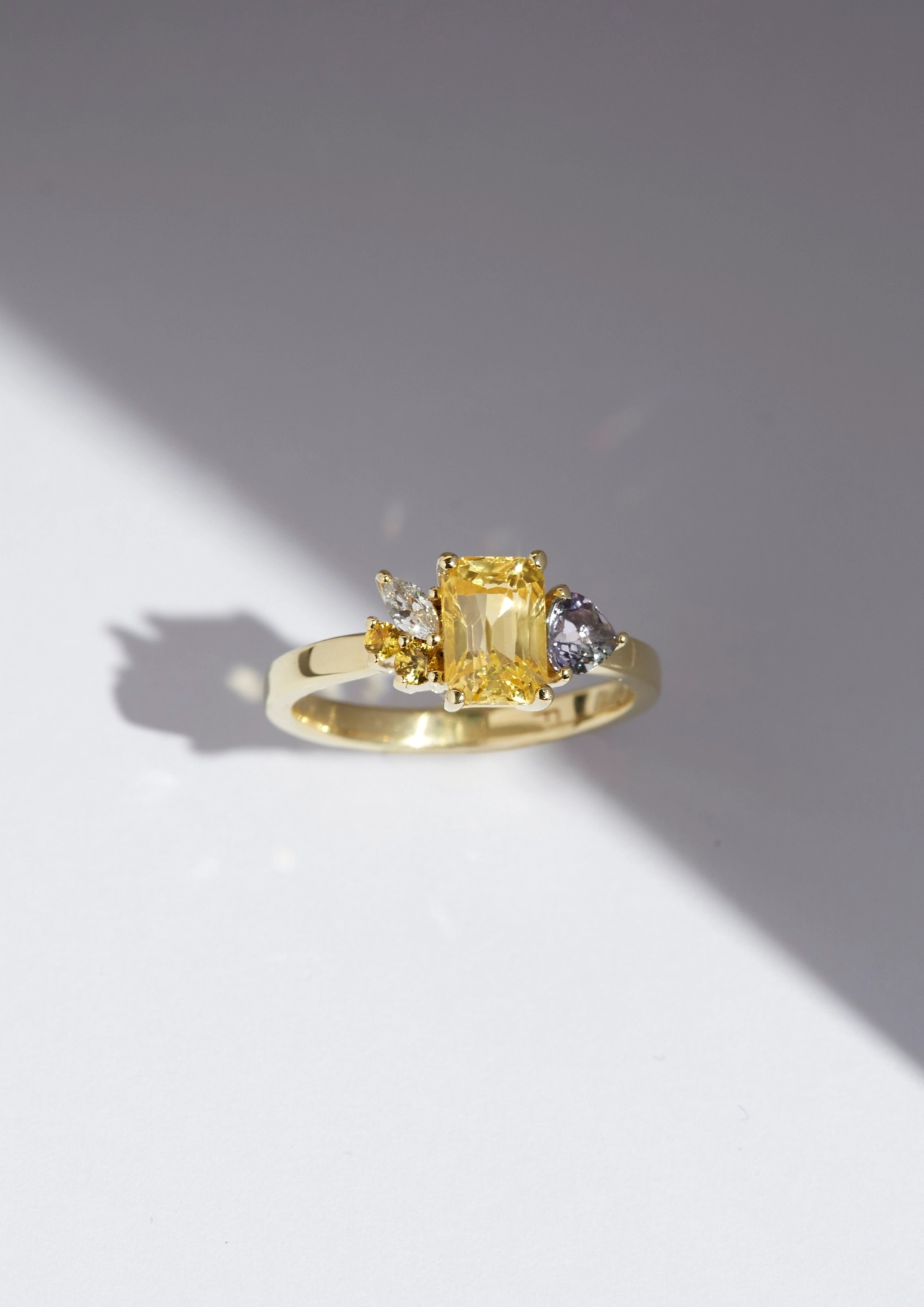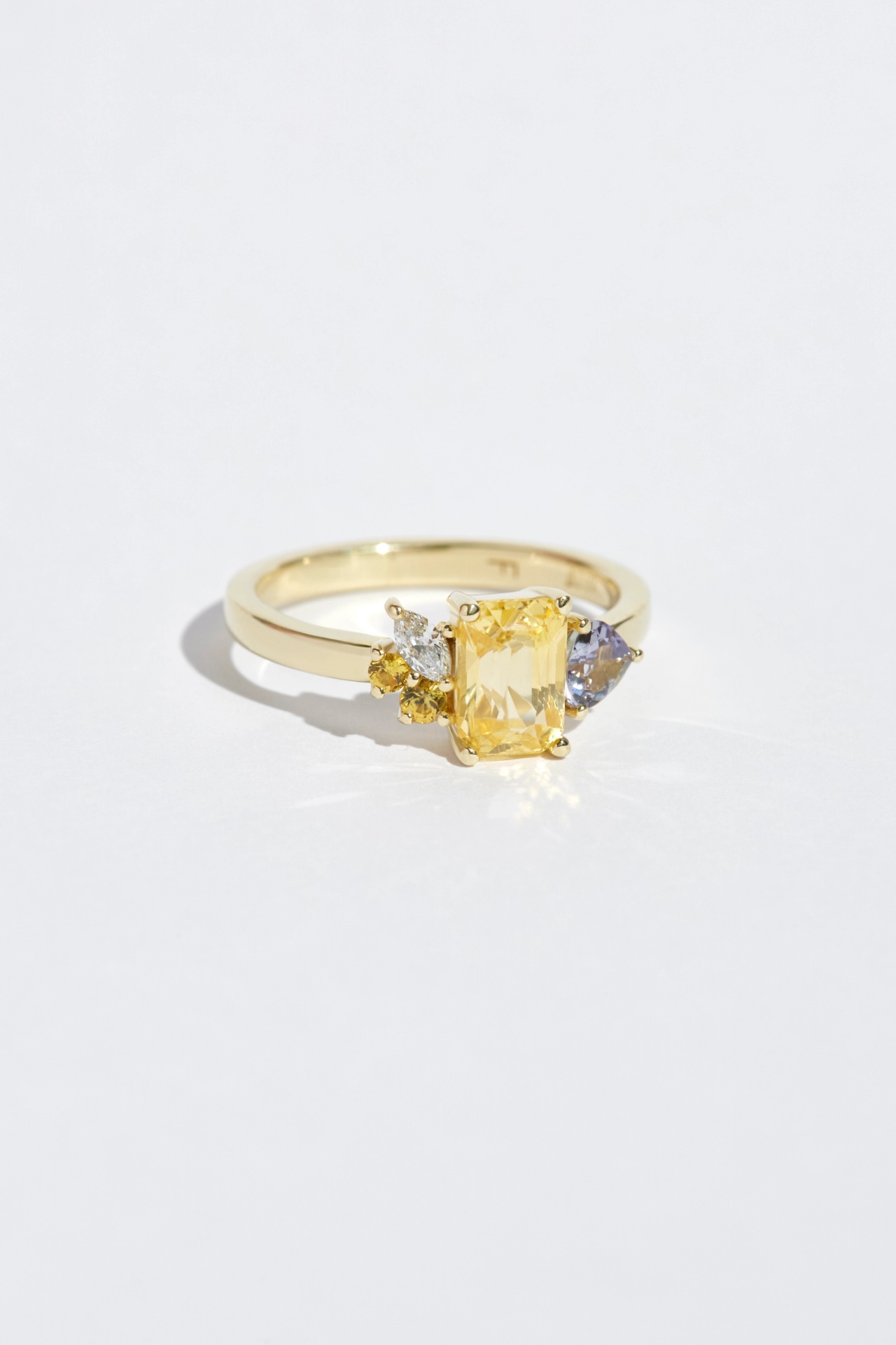The Sharon ring features a 1.5ct Yellow Sapphire clustered with a mix of sapphires, diamonds and tanzanites.
