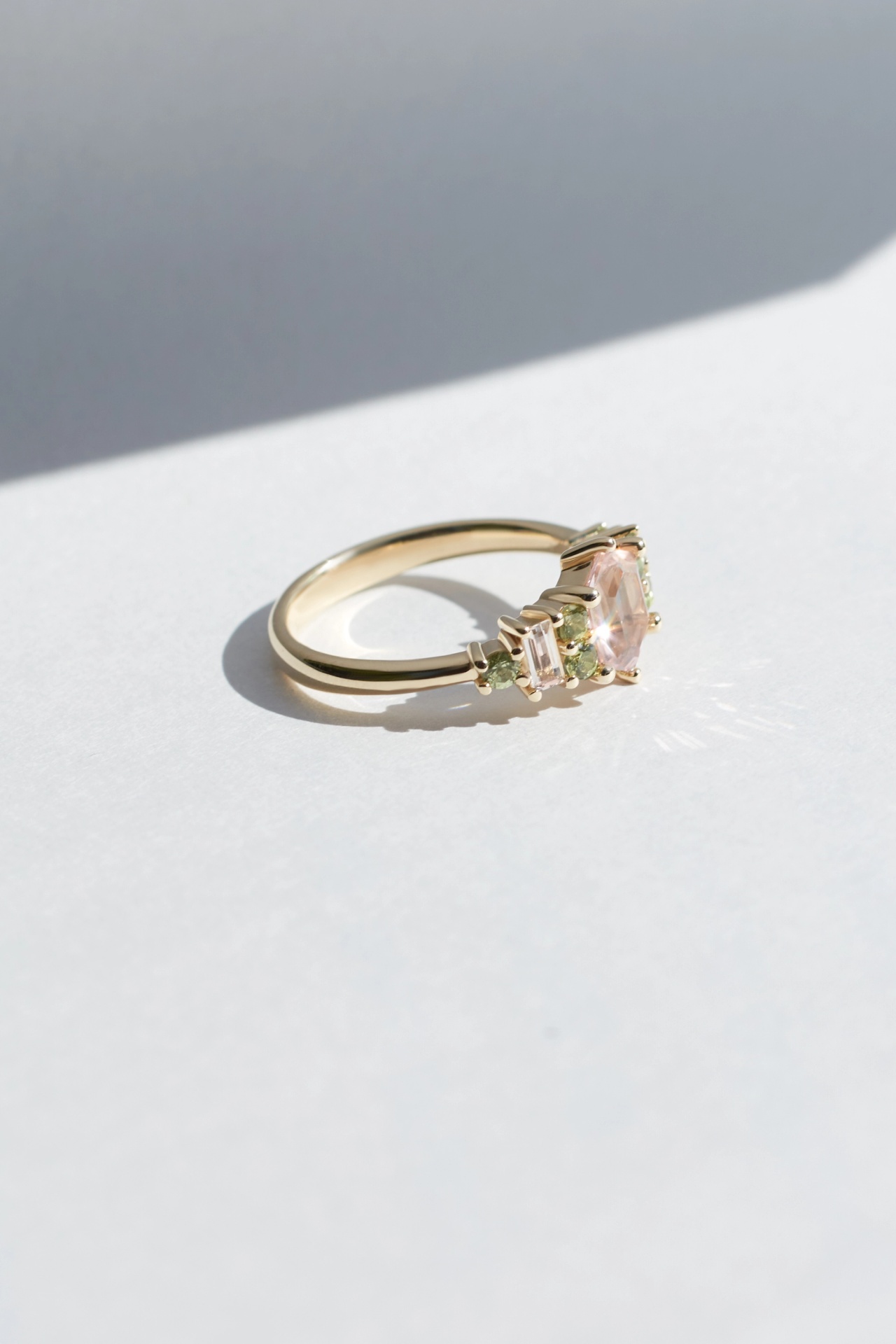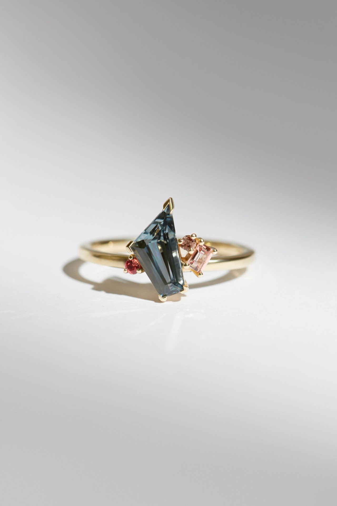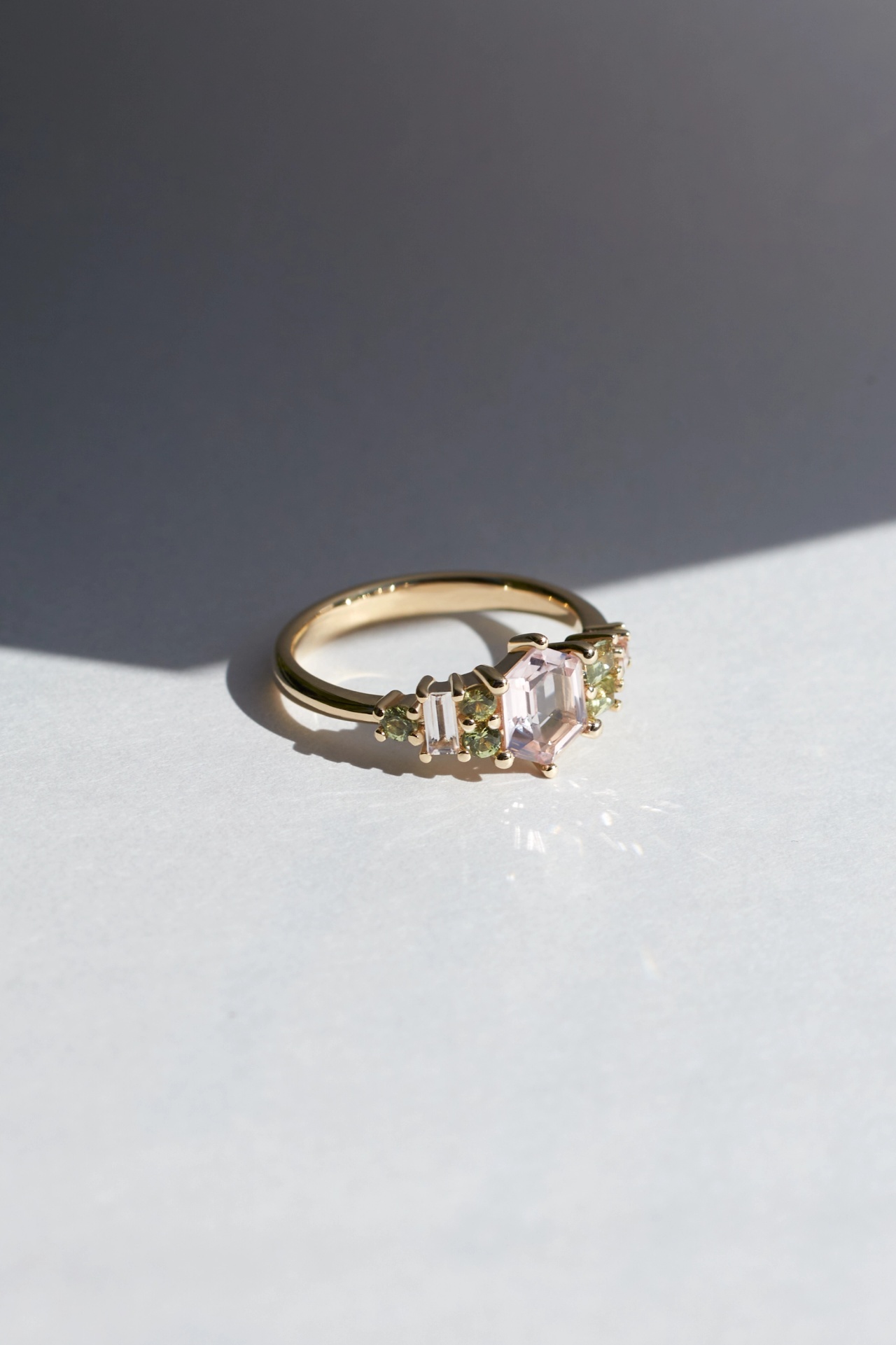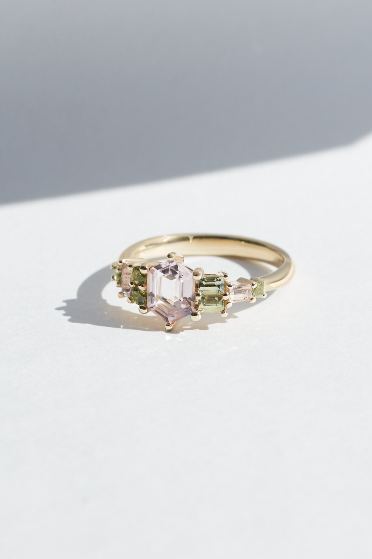 The Sharon ring features a 1.5ct Yellow Sapphire clustered with a mix of sapphires, diamonds and tanzanites.
