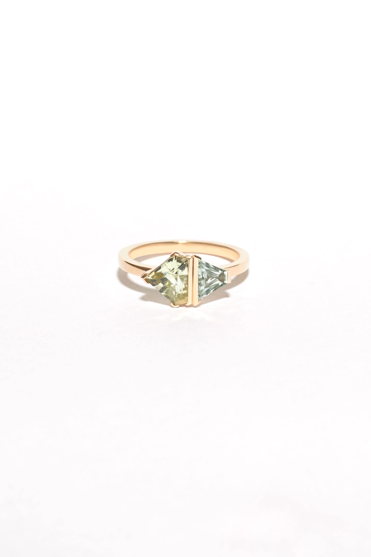 The Tisha Ring features a 1.28 Freeform grey Spinel in a modified bezel with 3 Sapphires on a square wire shank.